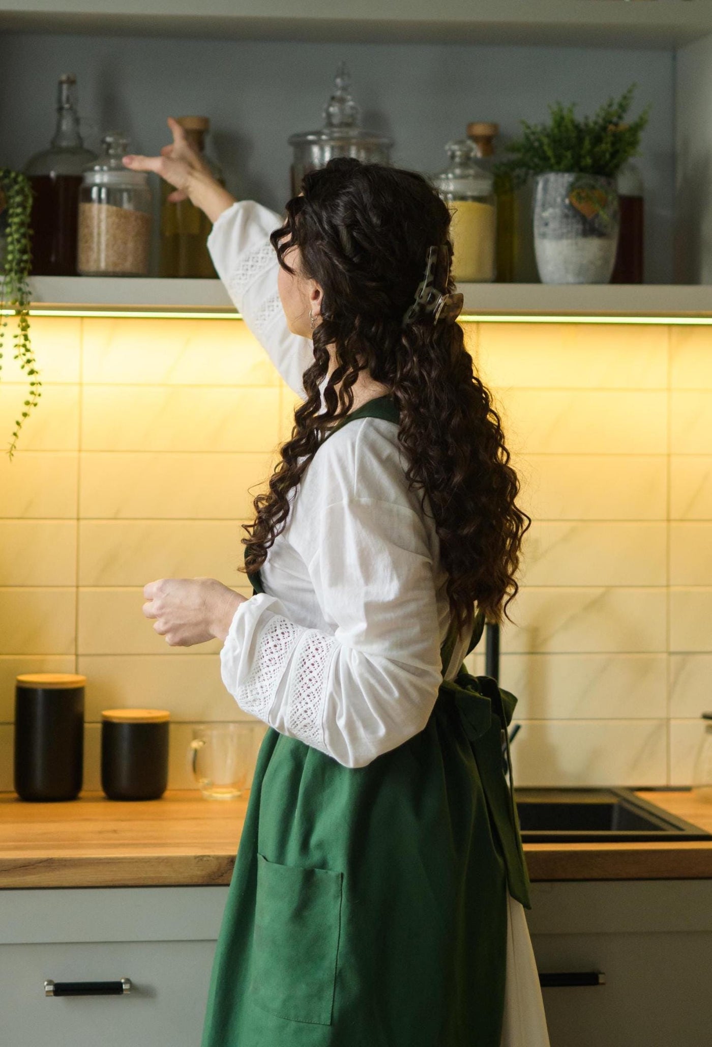 The fabric features a light water- and stain-repellent effect, helping the apron stay cleaner for longer. Liquids don’t absorb instantly, giving you time to quickly wipe them off — ideal for busy home cooking and baking.